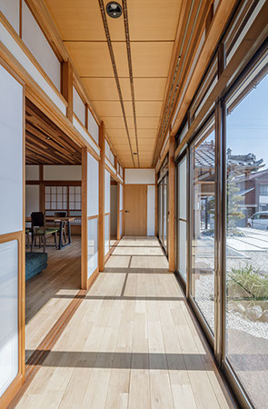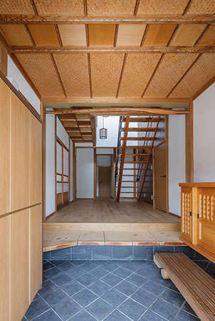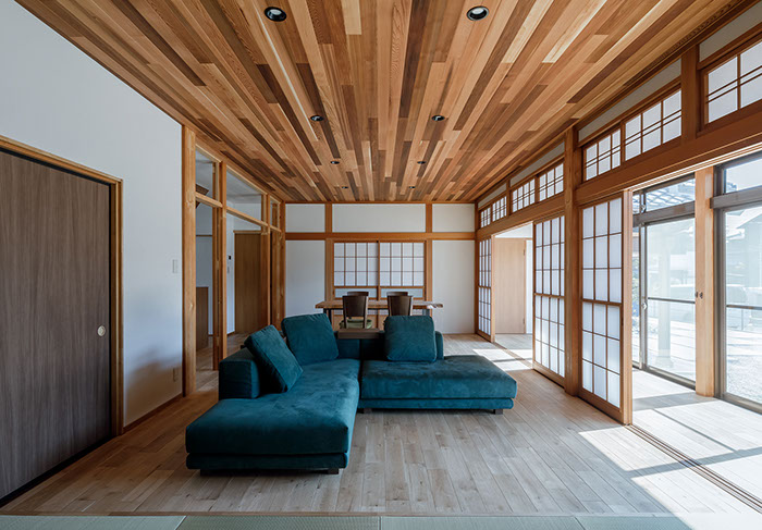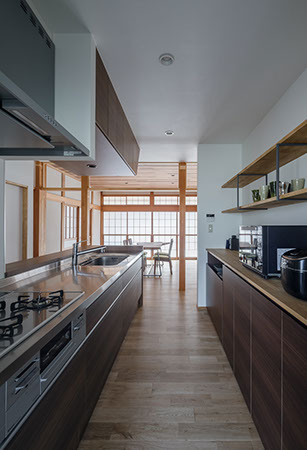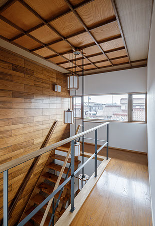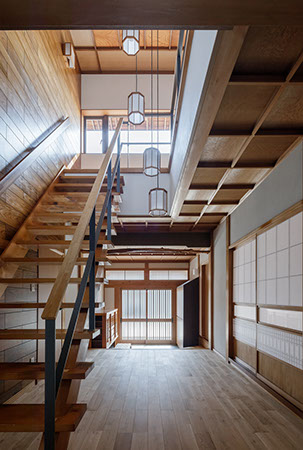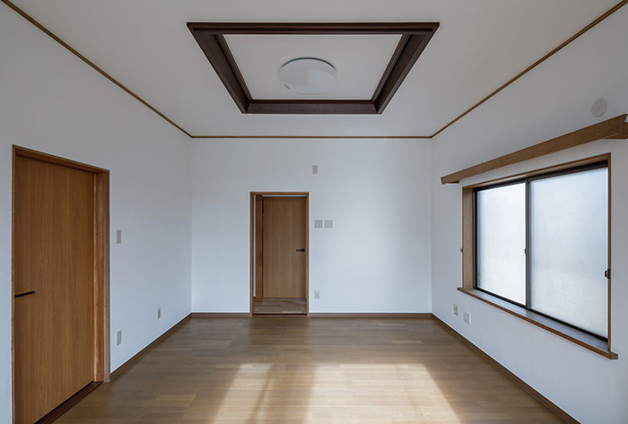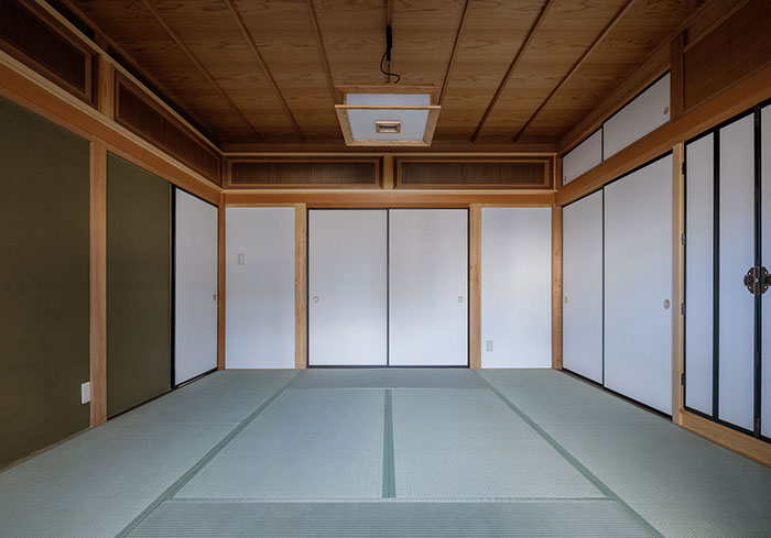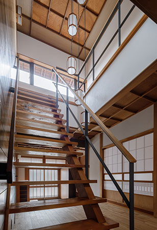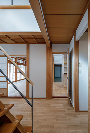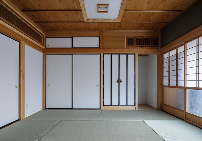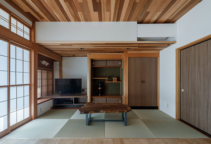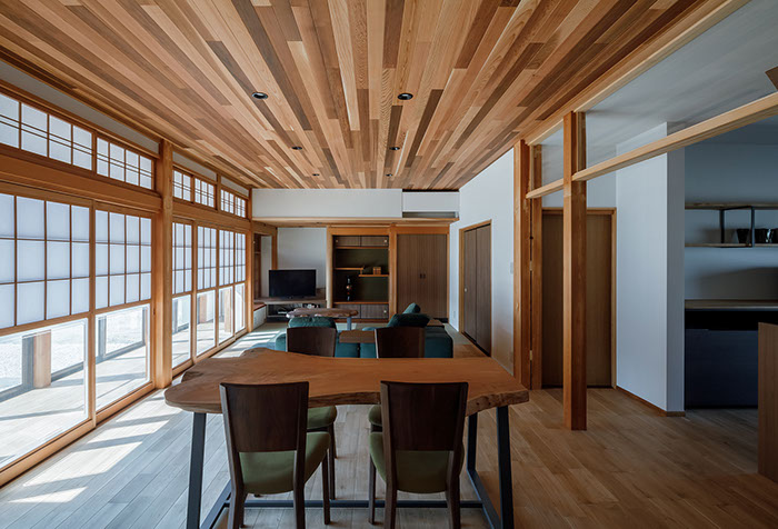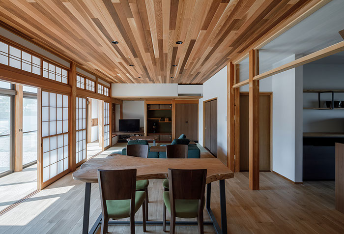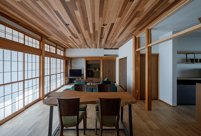 木造2階建てのリフォーム物件。元々が立派な材料を使っていたこともあり、解体時に不要となる既存部材を加工・転用して再利用することを前提として計画は始まりました。既存の和風要素は残しつつもモダン要素を多く取り入れた内部空間としており、建具で仕切られていた3室の和室を一続きの大きなLDK空間に変えて開放感が得るようにしています。そして、不要となった既存部材は各室各所に加工・転用して新たな命を吹き込み、リビングに残した既存の書院や違い棚には手を加えずに新たな用途へ変えたり、既存部材を取り外した跡の埋木をあえて模様化することで、過去の記憶を継承させています。過去の素材と新たな素材を上手く融合させ、居心地よく開放感のある空間となりました。