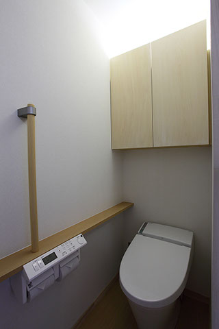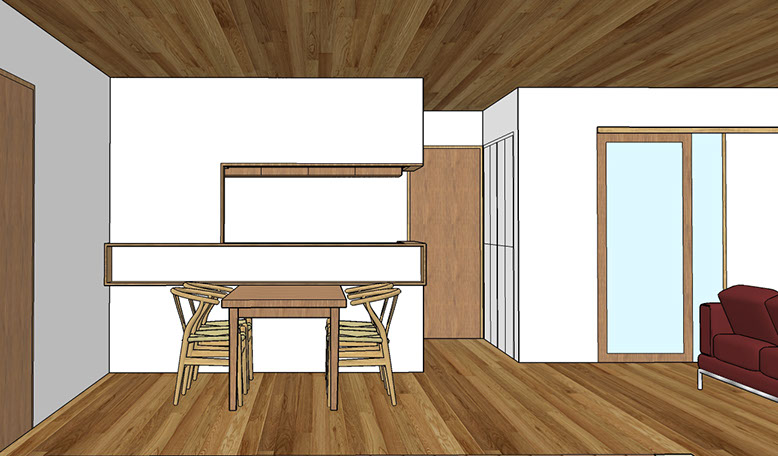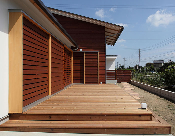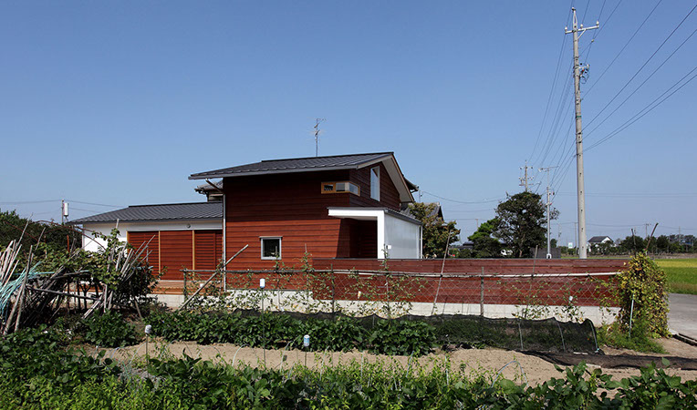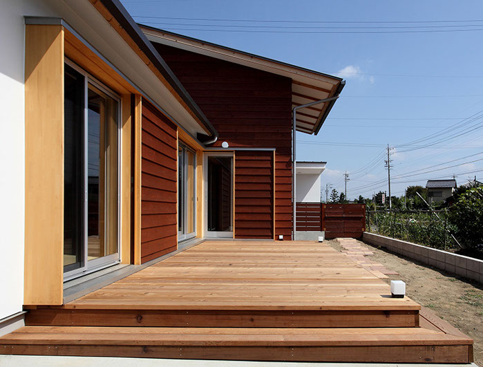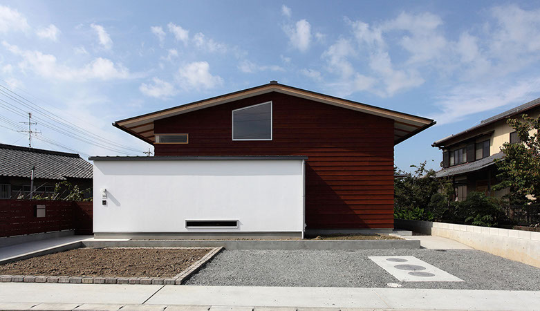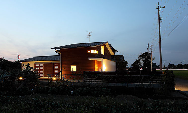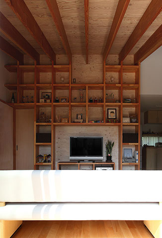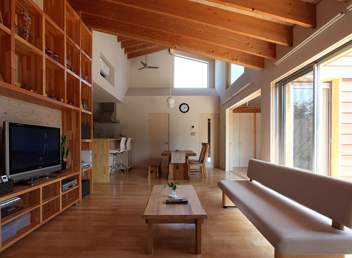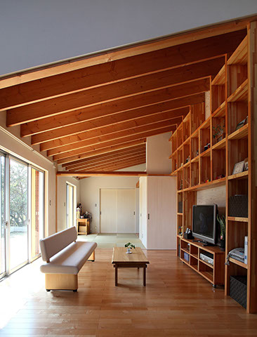 自然光が沢山入り込み、温かさや木のぬくもりを肌で感じれるワンルーム形式の木造平屋建ての住宅。玄関を抜けると東西に伸びた吹抜けのある開放的なワンルーム形式の居室空間(LDK)へ繋がります。生活の中心をLDKとし、その周りには仕切りを極力なくしたプライベート空間を配置することで室内空間の統一化を図っています。基本的な生活はワンルーム形式ですが将来、子供の成長などによるプライバシーの確保を考慮しプライベート空間は建具によって仕切れる計画としています。