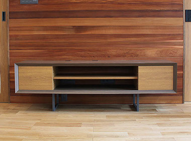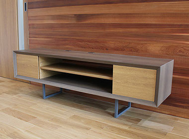 どの場所に置いても宙に浮いているかのごとく存在するTVボードのバージョンアップ型。空間に合せたマテリアルの選択と本体の厚みを薄くして軽快さを出し、浮遊感を出す為に脚の部材を極力細くしている。