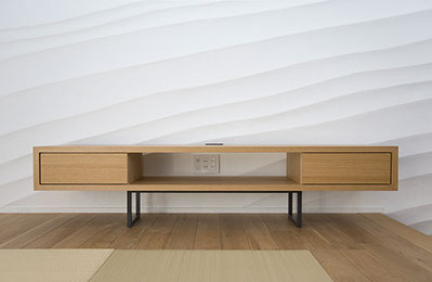 どの場所に置いても宙に浮いているかのごとく存在するTVボード。本体の厚みを薄くして軽快さを出し、浮遊感を出す為に脚の部材を極力細くしている。