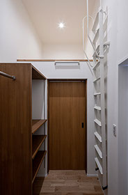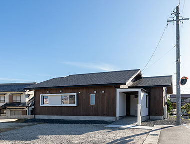 高台にある広々とした敷地に計画した平屋建ての新築住宅。シンプルな切妻形状で白と濃い木質のコントラストが特徴的な外観となっています。LDKが中心となっている内部は、廊下を無くした間取になっており生活の大半はLDKで過ごします。どの部屋へもLDKを中心に移動し、再度LDKに集まります。そして他の部屋より高くした天井が開放感を与え、木素材の温もりを感じながらくつろげる空間となっています。玄関内の壁は「諏訪の家」に続いて、左官職人の久住有生氏による施工。緩やかな美しい曲線とその曲線で別けられた対照的な素材感が住む人に安らぎと心の豊かさを与え、毎日の送迎をしてくれます。