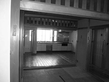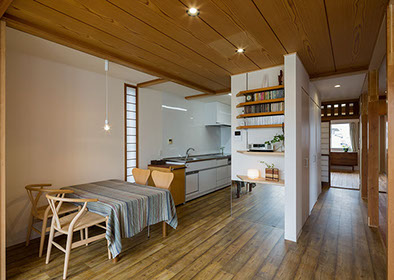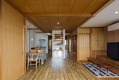 既存の建具や部材などをできる限り使いたいという考えから始まったリフォームの物件。元々は和室続きであった空間をLDKに変え、寝室と一続きのワンルーム的な使用ができる計画としています。また回遊性のある導線計画としている為、あらゆる場所から目的の場所まで最短距離で移動できます。既存建具や解体ででた部材(天井材、柱、枠材、長押等)は各所に加工・転用し、惜しみなく使用しています。