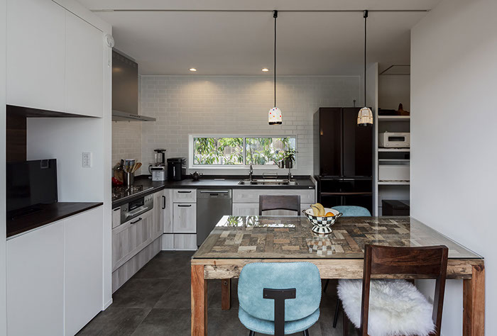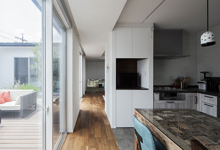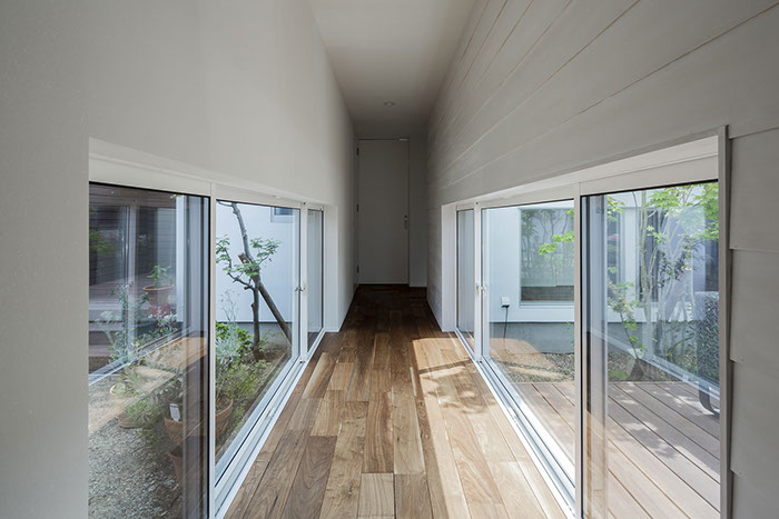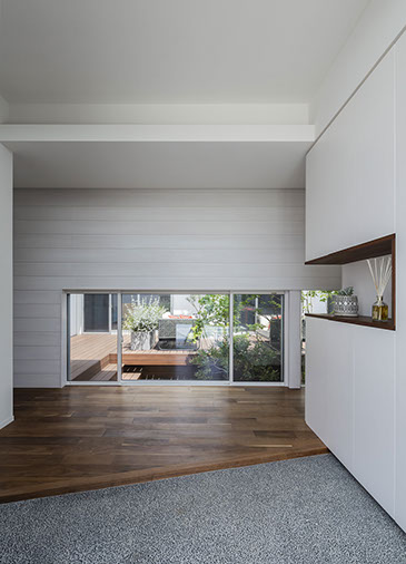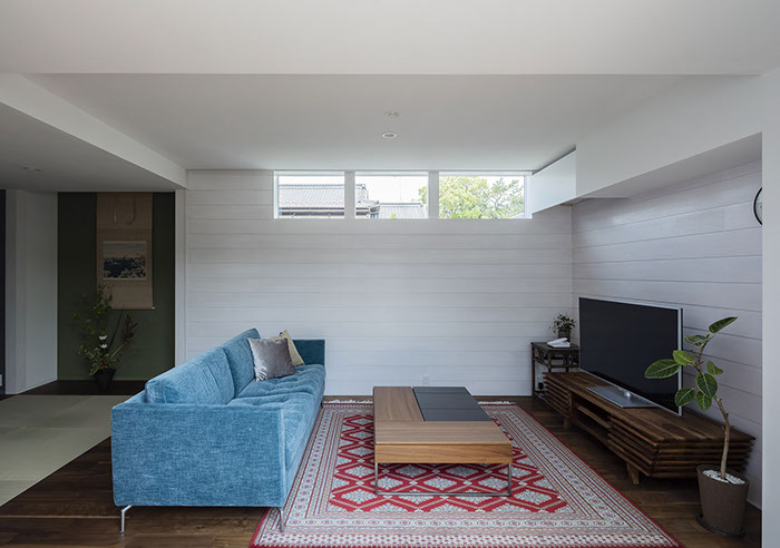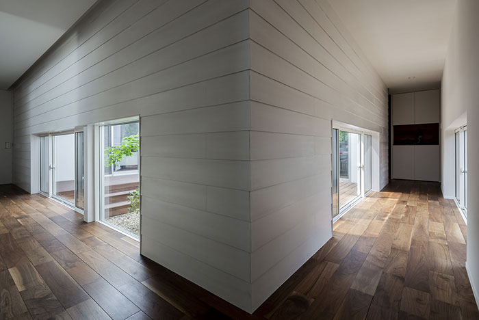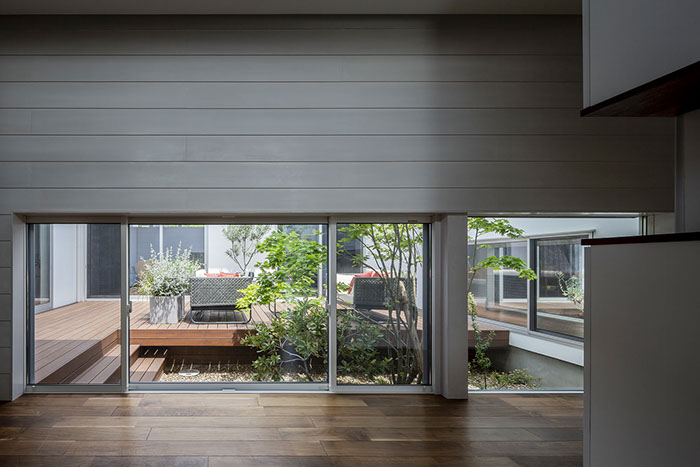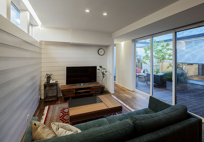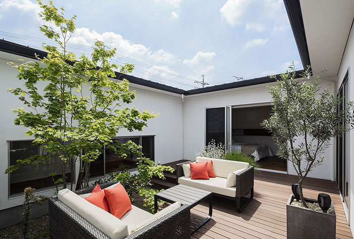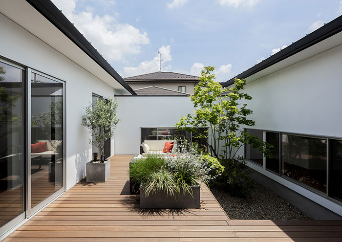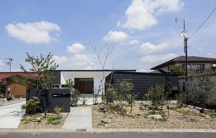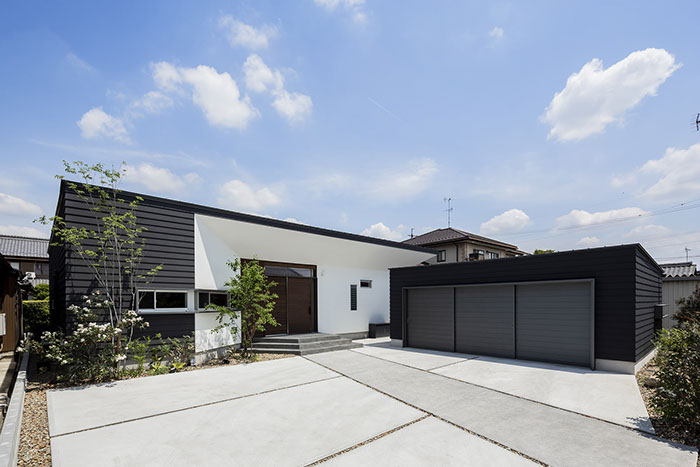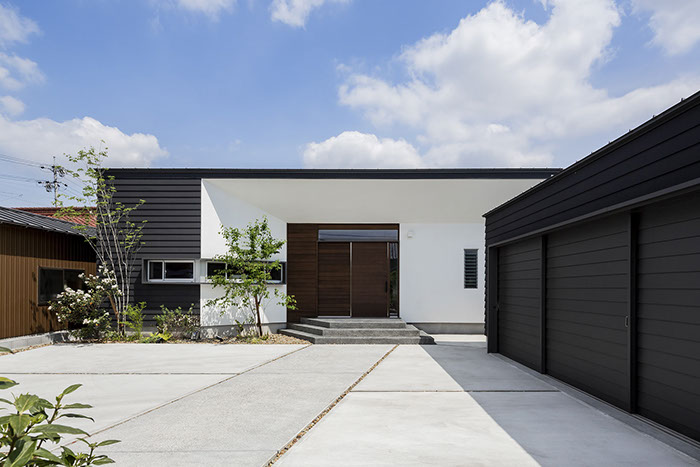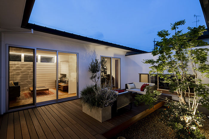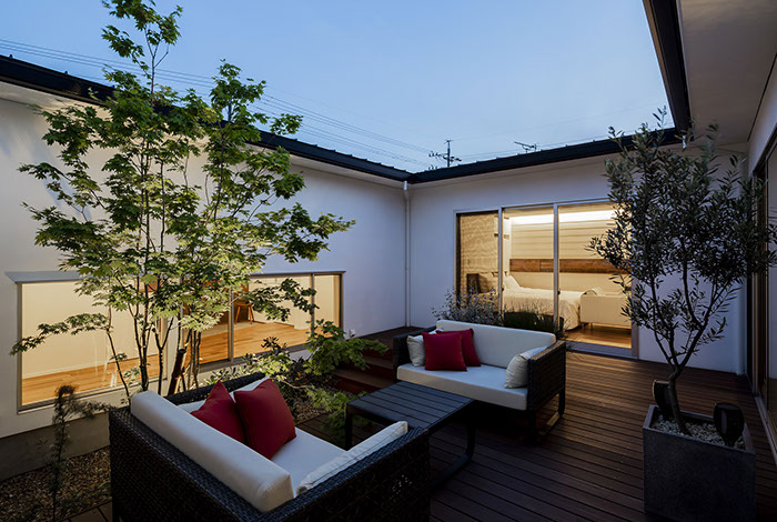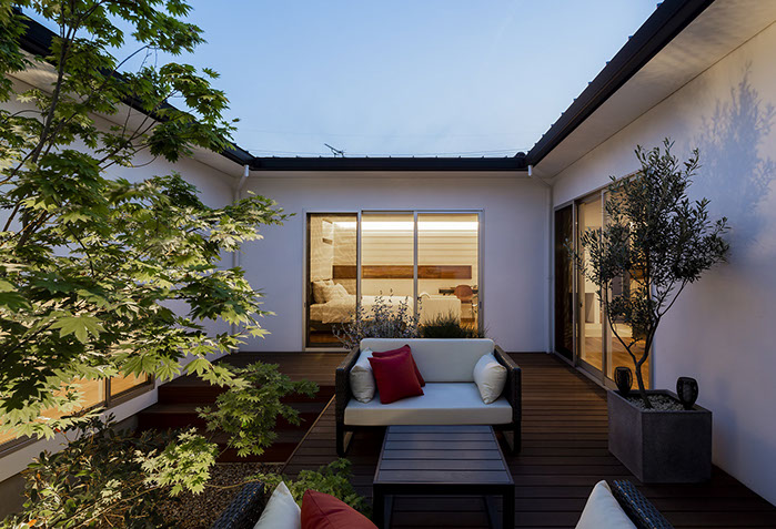 建築主は各部屋から緑が眺められ、安らぎと豊かさを感じながら過ごせるリゾート感のある平屋建て住宅を望んでいました。コントラストが効いた印象的な外観と夜間でも植栽の影が外壁に映るように計画した植栽計画など、昼夜問わず印象的な住宅となっています。外部に面する部分は閉鎖的にしてプライバシーを確保していますが、ロの字型の中庭形式にすることで、内部は外部との隔たりを感じさせない明るく開放感な空間になっています。中庭を囲んだ各部屋はどの場所からでも中庭へ行き来ができ、そして、どの場所からでも緑が眺められように視覚的にも繋げているので各所に広がりを感じさせています。