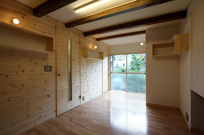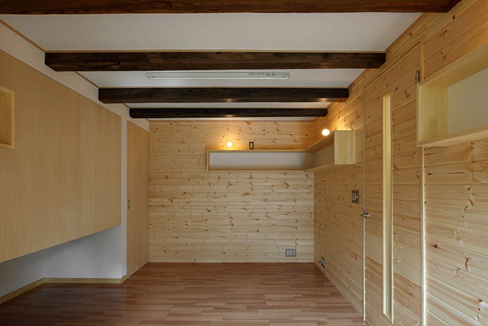 20代後半の若夫婦が生活する為に、築80年程になる住宅の1階離れを寝室にリフォームしました。基本的な間取りは変更せず、建具をなくしたり天井の高さを出来る限り高くして開放的な空間となるようにしました。
