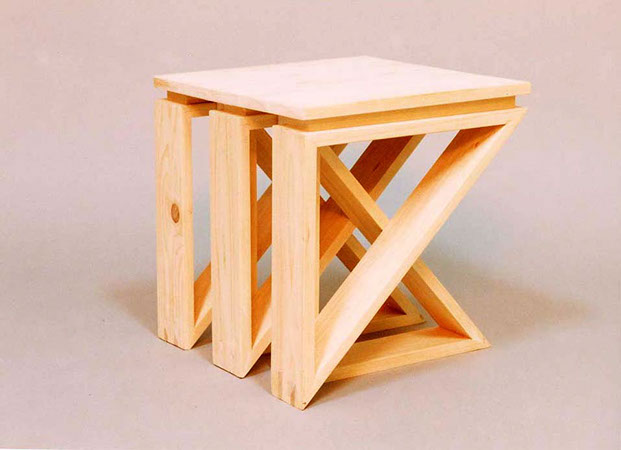 幅100mmのヒノキ板を三角形状に組み、同形のパーツを組合わせて使うスツール。並び替えより様々な形を作り出す。パーツを横に並びに増やしていけばベンチとしても使用可能。