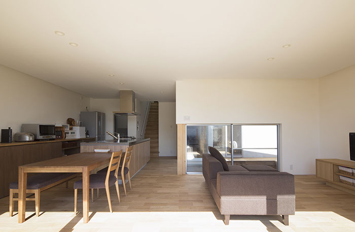 建築主は内外共にシンプルな空間の中で木の温もりが感じられる住宅を希望していました。建物形状を南北対象の意匠計画とし、部分的に木を使用することでシンプルな中に木の素材感が感じられる外観としました。内部は将来的な子供の独立を考慮し、基本的な生活は1階で完結できるようにしています。1階は共用部分と夫婦のプライベートスペース、2階は子供部屋としており比較的平屋建てに近い計画としています。リビングや寝室はテラスを介して回遊でき、内部から見る景色の中に中庭を取込むことで自然の豊かさを身近に感じられます。また白いシンプルな内部空間は、家具類や化粧柱などの一部意匠がポイントとなるよう配慮することで、シンプルでありながらも空間全体に統一感と木の温もりが感じられます。
