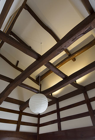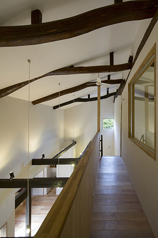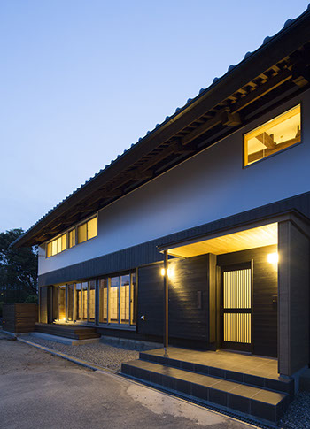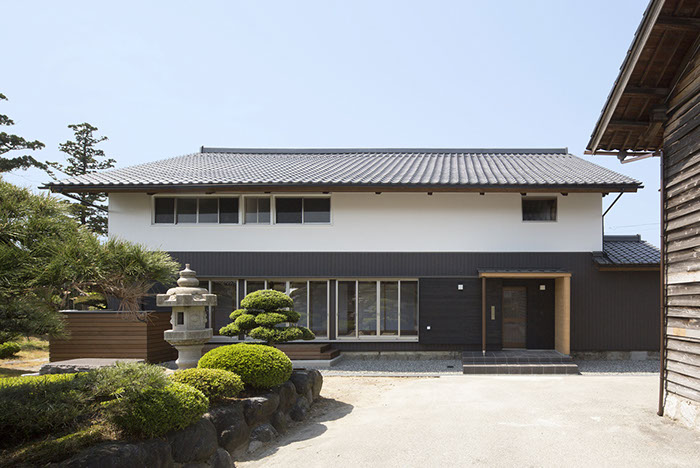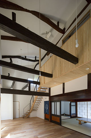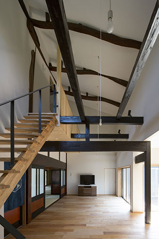 築65年程経つ古民家再生の物件。建築主は以前から「古民家に住みたい」という思いがありました。今回、縁あってこの古民家を購入することとなり、それを機に全面リフォームを行うこととなりました。外装は劣化が激しかった為、一部のアルミサッシ以外、屋根瓦、外壁を含め、全てを取替えています。内部は既存の柱や梁を意匠的に生かしつつ、元々の居室広さを有効的に使用出来るような平面計画とし、自然光をLDKにも多く取入れるように一部を減築して中庭テラスを計画しました。内外共に古民家の印象は残しつつも現代風の要素を取入れていいます。