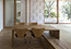 段差のある床で使用するダイニングテーブル。一枚板を折り曲げたような形状のこのテーブルは、左右で脚の高さを変えている為、本体を移動することで畳での使用や椅子での使用に対応する。仕上げ材に床フローリングと同材を使用することで空間に統一感を与える。