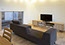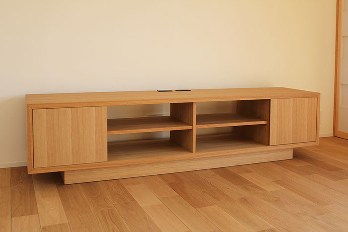 見せたい物は見せ、隠したい物は隠すためのTVボード。木の素材感が温かみを与え、素朴なデザインが室内空間に違和感なく溶け込む。