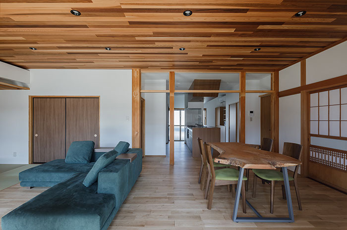 木造2階建てのリフォーム物件。元々が立派な材料を使っていたこともあり、解体時に不要となる既存部材を加工・転用して再利用することを前提として計画は始まりました。既存の和風要素は残しつつもモダン要素を多く取り入れた内部空間としており、建具で仕切られていた3室の和室を一続きの大きなLDK空間に変えて開放感が得るようにしています。そして、不要となった既存部材は各室各所に加工・転用して新たな命を吹き込み、リビングに残した既存の書院や違い棚には手を加えずに新たな用途へ変えたり、既存部材を取り外した跡の埋木をあえて模様化することで、過去の記憶を継承させています。過去の素材と新たな素材を上手く融合させ、居心地よく開放感のある空間となりました。