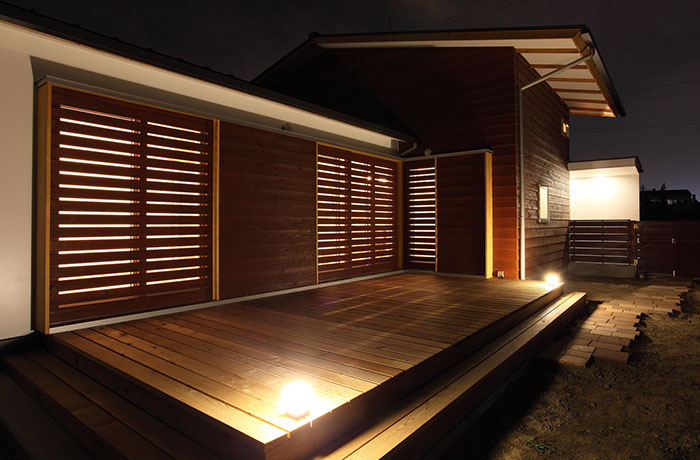 自然光が沢山入り込み、温かさや木のぬくもりを肌で感じれるワンルーム形式の木造平屋建ての住宅。玄関を抜けると東西に伸びた吹抜けのある開放的なワンルーム形式の居室空間(LDK)へ繋がります。生活の中心をLDKとし、その周りには仕切りを極力なくしたプライベート空間を配置することで室内空間の統一化を図っています。基本的な生活はワンルーム形式ですが将来、子供の成長などによるプライバシーの確保を考慮しプライベート空間は建具によって仕切れる計画としています。