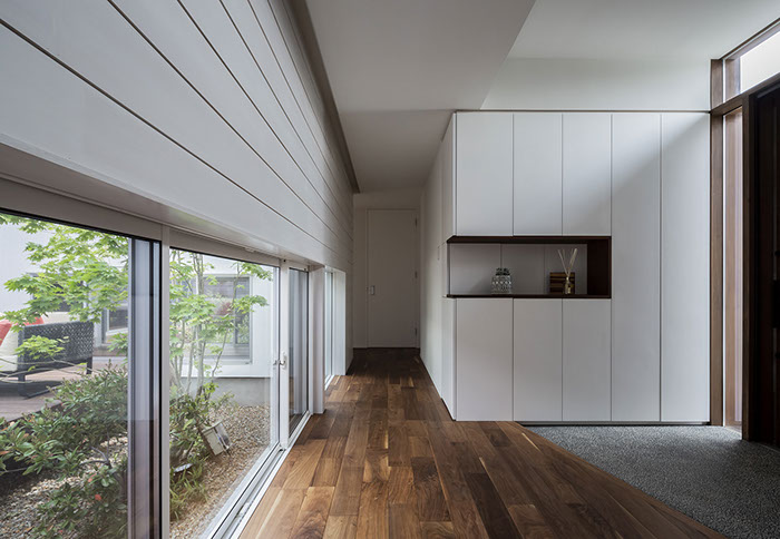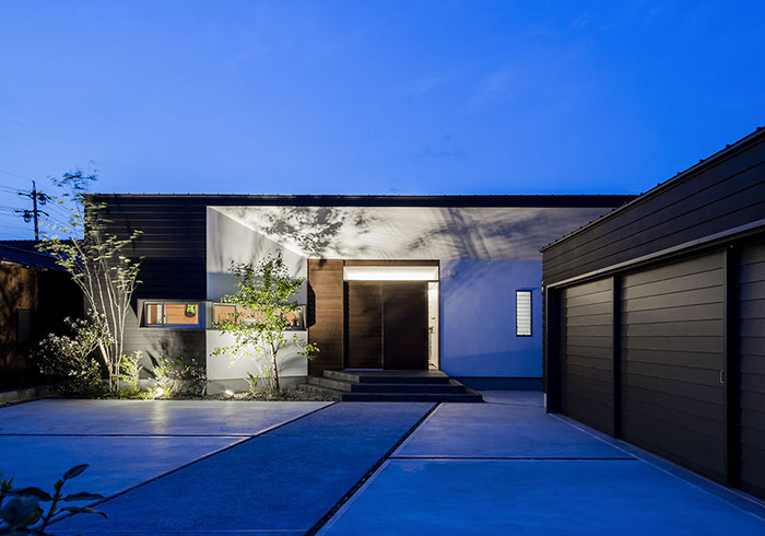 建築主は各部屋から緑が眺められ、安らぎと豊かさを感じながら過ごせるリゾート感のある平屋建て住宅を望んでいました。コントラストが効いた印象的な外観と夜間でも植栽の影が外壁に映るように計画した植栽計画など、昼夜問わず印象的な住宅となっています。外部に面する部分は閉鎖的にしてプライバシーを確保していますが、ロの字型の中庭形式にすることで、内部は外部との隔たりを感じさせない明るく開放感な空間になっています。中庭を囲んだ各部屋はどの場所からでも中庭へ行き来ができ、そして、どの場所からでも緑が眺められように視覚的にも繋げているので各所に広がりを感じさせています。