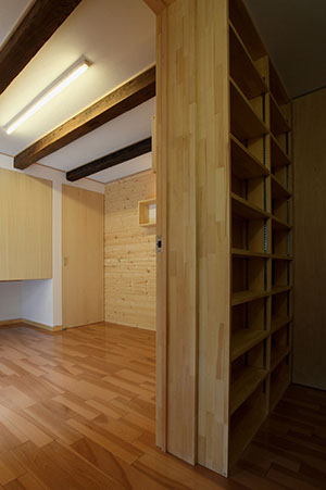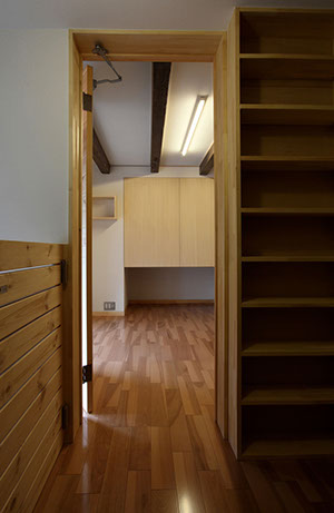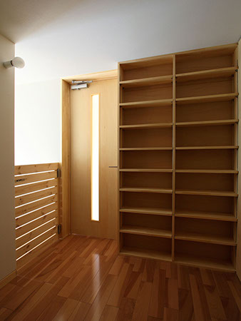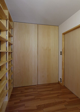 収納力(特に本類や小物類の収納)も求められていた為、壁面に出来る限るの収納棚を計画しています。また、飼い犬を室内で飼いたいとの要望があり飼い犬専用の個室も用意しています。