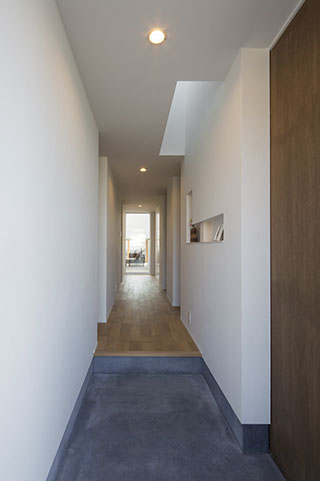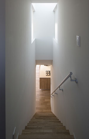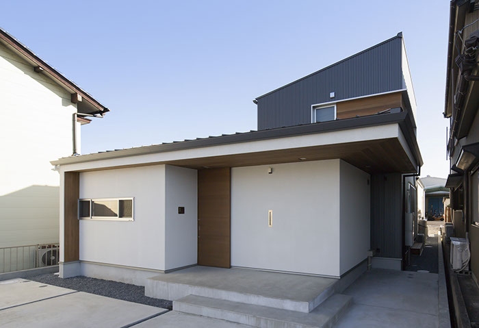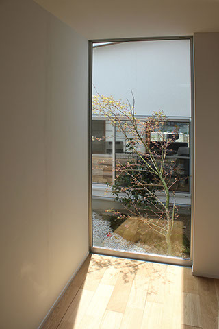 建築主は内外共にシンプルな空間の中で木の温もりが感じられる住宅を希望していました。建物形状を南北対象の意匠計画とし、部分的に木を使用することでシンプルな中に木の素材感が感じられる外観としました。内部は将来的な子供の独立を考慮し、基本的な生活は1階で完結できるようにしています。1階は共用部分と夫婦のプライベートスペース、2階は子供部屋としており比較的平屋建てに近い計画としています。リビングや寝室はテラスを介して回遊でき、内部から見る景色の中に中庭を取込むことで自然の豊かさを身近に感じられます。また白いシンプルな内部空間は、家具類や化粧柱などの一部意匠がポイントとなるよう配慮することで、シンプルでありながらも空間全体に統一感と木の温もりが感じられます。