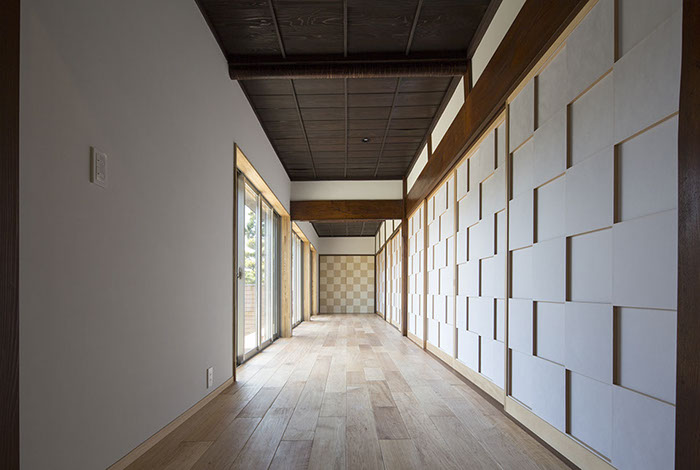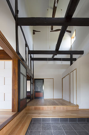 築65年程経つ古民家再生の物件。建築主は以前から「古民家に住みたい」という思いがありました。今回、縁あってこの古民家を購入することとなり、それを機に全面リフォームを行うこととなりました。外装は劣化が激しかった為、一部のアルミサッシ以外、屋根瓦、外壁を含め、全てを取替えています。内部は既存の柱や梁を意匠的に生かしつつ、元々の居室広さを有効的に使用出来るような平面計画とし、自然光をLDKにも多く取入れるように一部を減築して中庭テラスを計画しました。内外共に古民家の印象は残しつつも現代風の要素を取入れていいます。